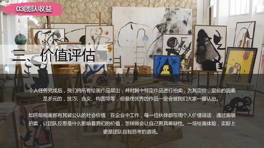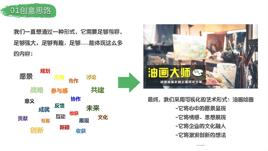 通過(guò)團(tuán)隊(duì)的努力完成一幅具有企業(yè)文化代表意義的油畫(huà),用視覺(jué)的感觀直接呈現(xiàn)在面前,提升企業(yè)員工的企業(yè)歸宿感,同時(shí),在前期制作過(guò)程中,團(tuán)隊(duì)成員的相互協(xié)作,增進(jìn)團(tuán)隊(duì)成員間的凝聚力.參與者要用畫(huà)筆和顏料,揮灑藝術(shù)才能,繪出史詩(shī)般的巨幅畫(huà)作。