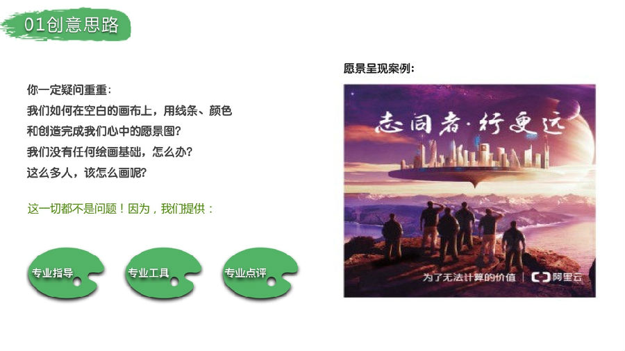 企業(yè)愿景是很難用語(yǔ)言去描述的事物!那么,我們換一種形式,用圖畫(huà)的方式呈現(xiàn)出來(lái),也許,畫(huà)畫(huà)一直是從小就有的夢(mèng)想,但是從來(lái)沒(méi)有真正完成過(guò)自己的畫(huà)作,這個(gè),讓你一圓夙愿。也許,很多人一開(kāi)始從來(lái)沒(méi)有想過(guò)自己的那幅畫(huà)能有多大作用,但是,當(dāng)最終的畫(huà)作呈現(xiàn)在面前時(shí),他會(huì)發(fā)現(xiàn)自己獨(dú)一無(wú)二的特性。